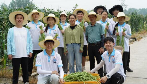 农场里,翠绿藤蔓缠绕支架,串串豇豆垂挂其间。实践队员们身穿统一服装,头戴草帽,手持皮筋,在农场主人的简单指导后,便满怀期待地踏入这片土地之中。