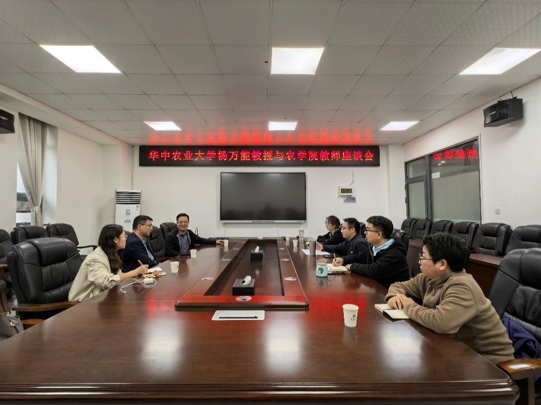 随后,杨万能教授与公司副经理张运波、经理助理兼农学系主任邓锋林,以及教师代表曾凡荣、覃元、朱相潜等人举行座谈。双方围绕 “作物表型平台设计与落地建设”“交叉学科教学科研团队组建与人员配置”“智慧农业方向培育与发展”“作物学一流学科内涵建设” 等关键议题深入交流,杨教授结合自身团队经验与行业前沿趋势,为公司学科专业建设、特色方向发展提供了兼具专业性与可操作性的指导建议。
