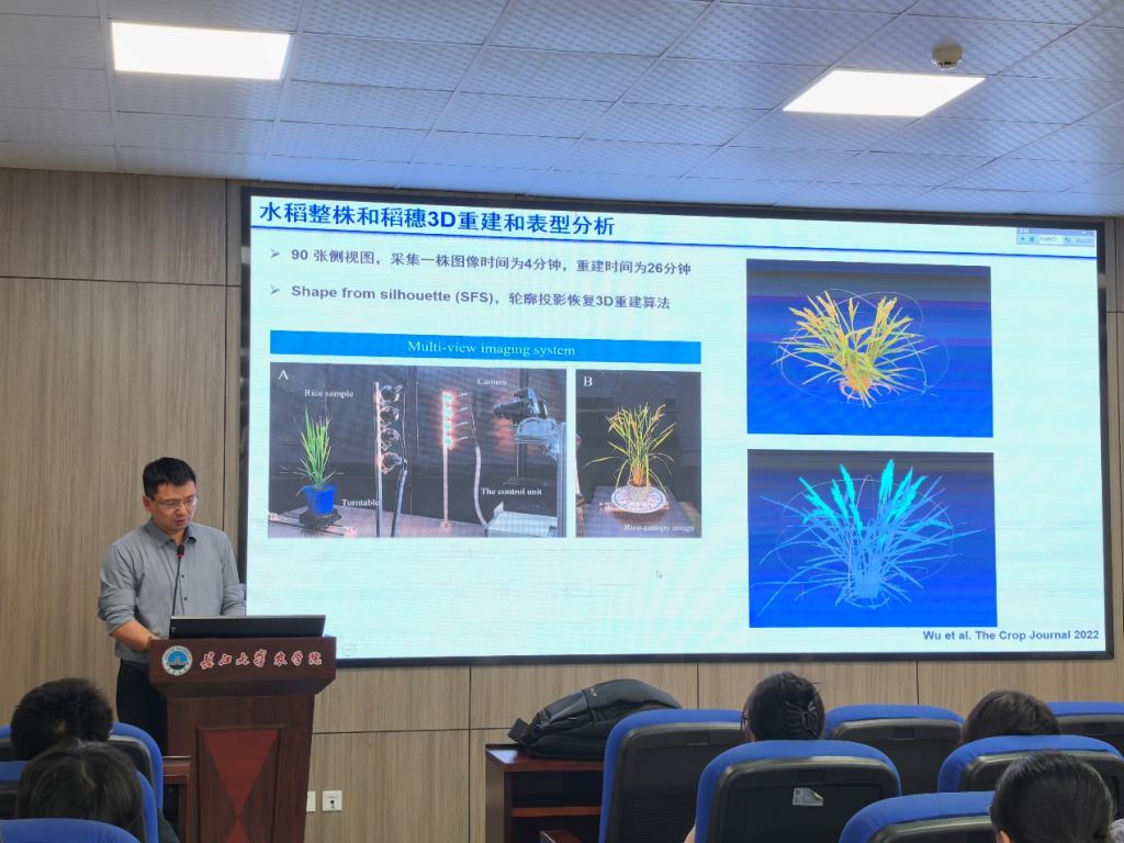 首先,杨万能教授为公司师生作题为“作物表型组学前沿技术研究与应用”的学术报告。在报告中,杨教授通过生动有趣的案例、通俗易懂的语言,详细介绍了其团队围绕作物性状表型数据“高通量、高质量、高效率”采集及分析目标,自主研发设备、编写程序的过程,同时分享了研发过程中遇到的技术瓶颈与创新解决思路;此外,还系统阐明了作物表型分析技术与基因组、代谢组等技术联合应用,进而挖掘作物关键功能基因的经典实践案例。报告结束后,杨教授与师生围绕“平台与传感器选择”“表型分析模型构建”等核心问题展开深入研讨,耐心解答师生疑问。此次报告有效开拓了师生学术视野,进一步激发了大家对农业信息技术、智慧农业等新兴领域的研究兴趣。