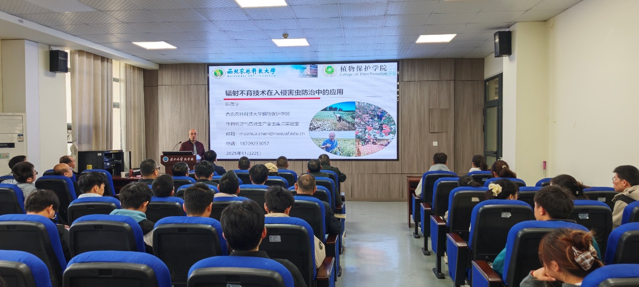 陈茂华教授深入浅出地介绍了昆虫绝育技术(Sterile Insects Technique ,SIT)的基本原理——通过辐射使雄虫不育,再将其大量释放到野外,使其与野外雌虫交配后无法产生后代,从而达到根除或控制害虫种群的目的。结合SIT技术在地中海实蝇、苹果蠹蛾和甘蔗条螟等重大入侵害虫防治上的成功案例,陈茂华教授生动阐述了SIT技术作为一种绿色、可持续、无农药残留、控制效率高的生物防治手段的巨大优势,为师生打开了一扇通往农业害虫绿色防控新世界的大门,展现了基础科学研究转化为强大生产力的现实路径。