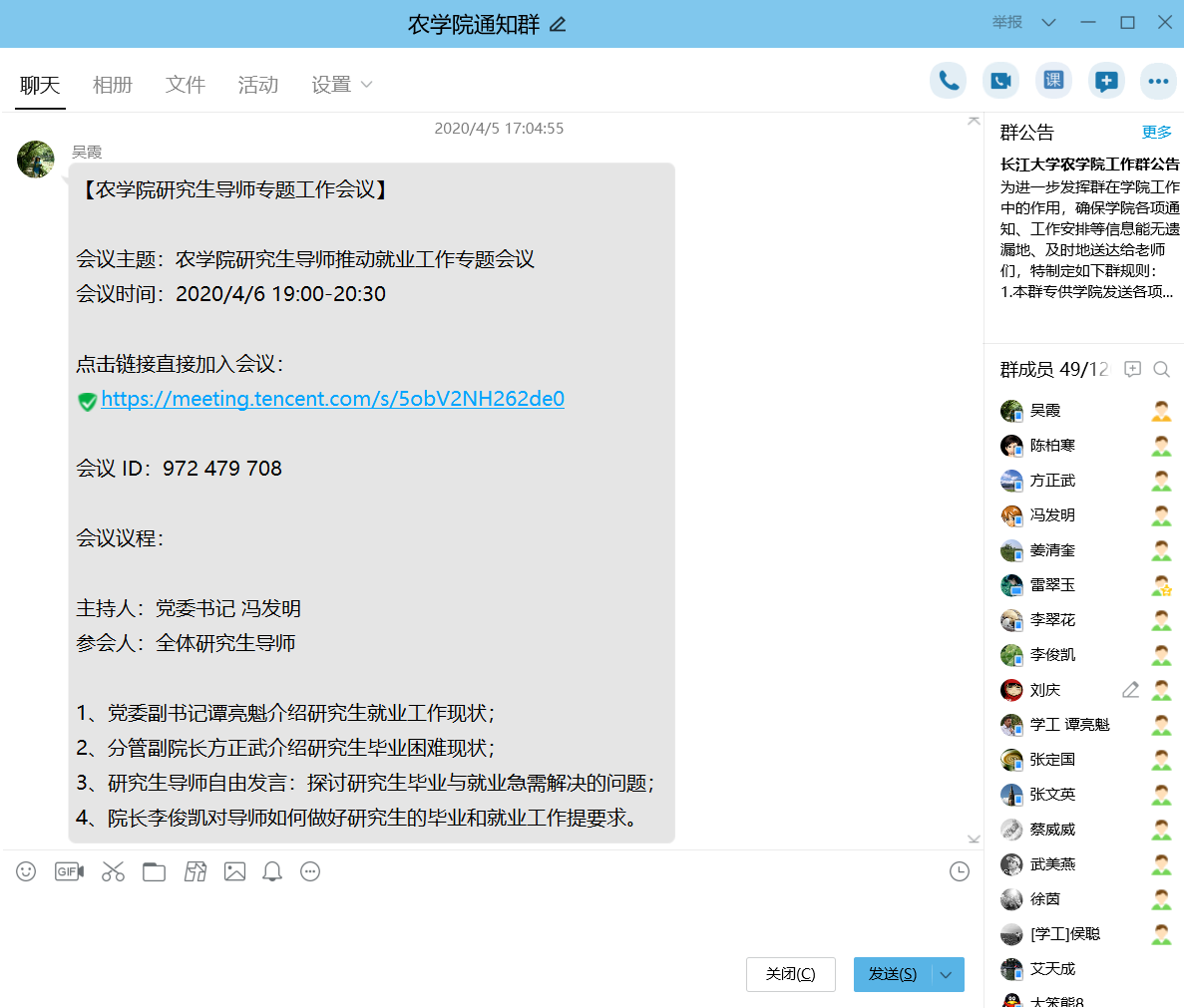通讯社讯(通讯员 吴霞 刘庆)为进一步做好2020届研究生就业工作,扎实推进研究生毕业生顺利毕业和成功就业,4月6日19:00,yl7703永利利用“腾讯会议”平台召开研究生导师推动就业工作专题会议。公司经理李俊凯、党委书记冯发明、副经理张文英、副经理方正武、党委副书记谭亮魁、全体研究生导师、各个科室负责人及全体辅导员共55人参加会议。会议由公司党委书记冯发明主持。