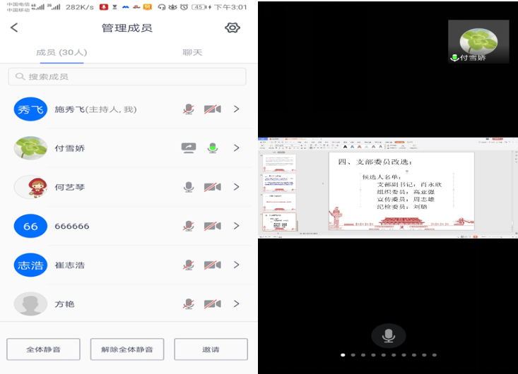 会议最后,与会同志对研究生第二党支部委员进行了改选。经过线上党员同志的投票表决,最终确定支部书记付雪娇、副书记肖永欣、组织委员高亚强、宣传委员周志雄和纪检委员刘璐等职务人选。付雪娇要求大家要积极参与支部的党组织活动,做好党员的先锋模范带头作用。
