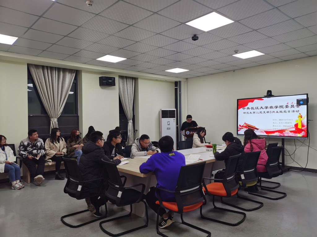 (通讯员 杨阳)为深入学习贯彻习近平总书记重要讲话及有关会议文件精神,以优异成绩迎接建党100周年,3月11日晚7点,研究生第二党支部在农科大楼3071开展了3月份主题党日活动,活动结合腾讯会议的方式开展。全体在公司党员、入党积极分子及校外联培党员参与了此次活动,会议由支部副书记肖永欣主持。