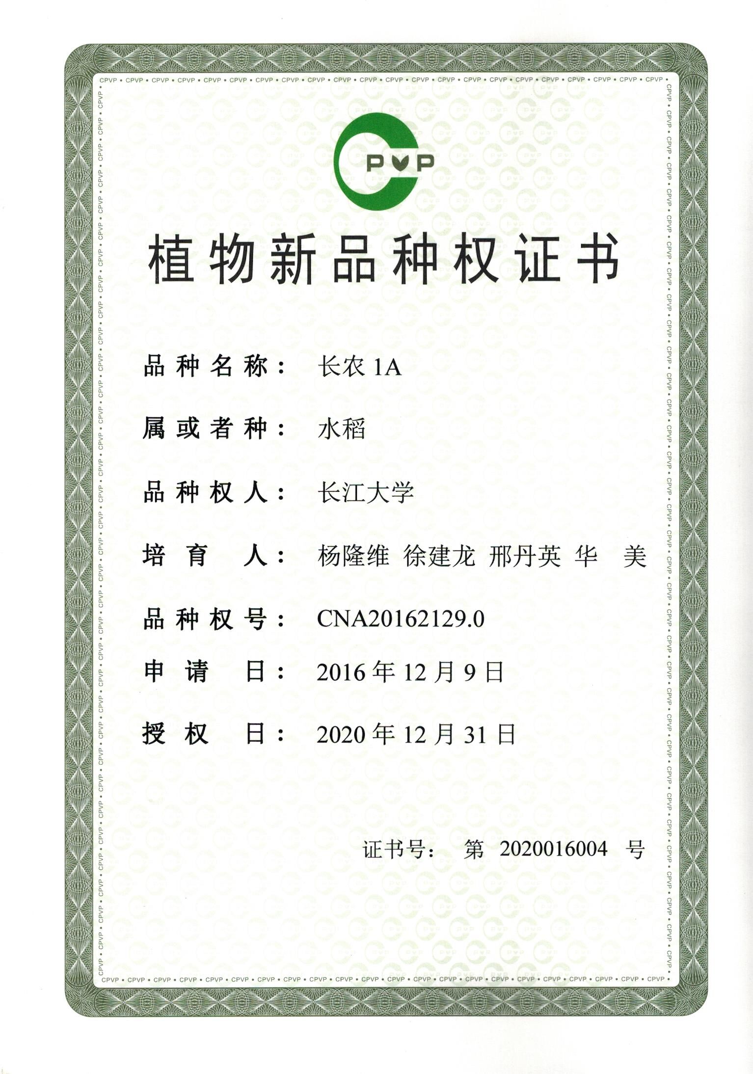 据了解,yl7703永利杨隆维教授团队一直高度重视杂交水稻新不育系选育,长农1A为该团队于2015年育成,2016年申请农业部植物新品种保护,历经4年多方获批授权。目前,该团队利用长农1A成功育成抗病杂交晚籼新品种长农优982,于2017年通过湖北省农作物新品种审定;育成的抗病早熟杂交中籼新品种长农优1531,有望通过2021年湖北省农作物新品种审定;育成的抗病杂交晚籼新品种长农优1521正在省区域试验程序中。
