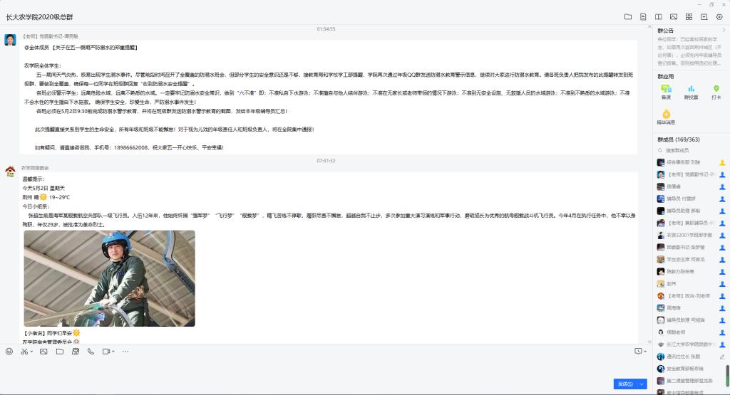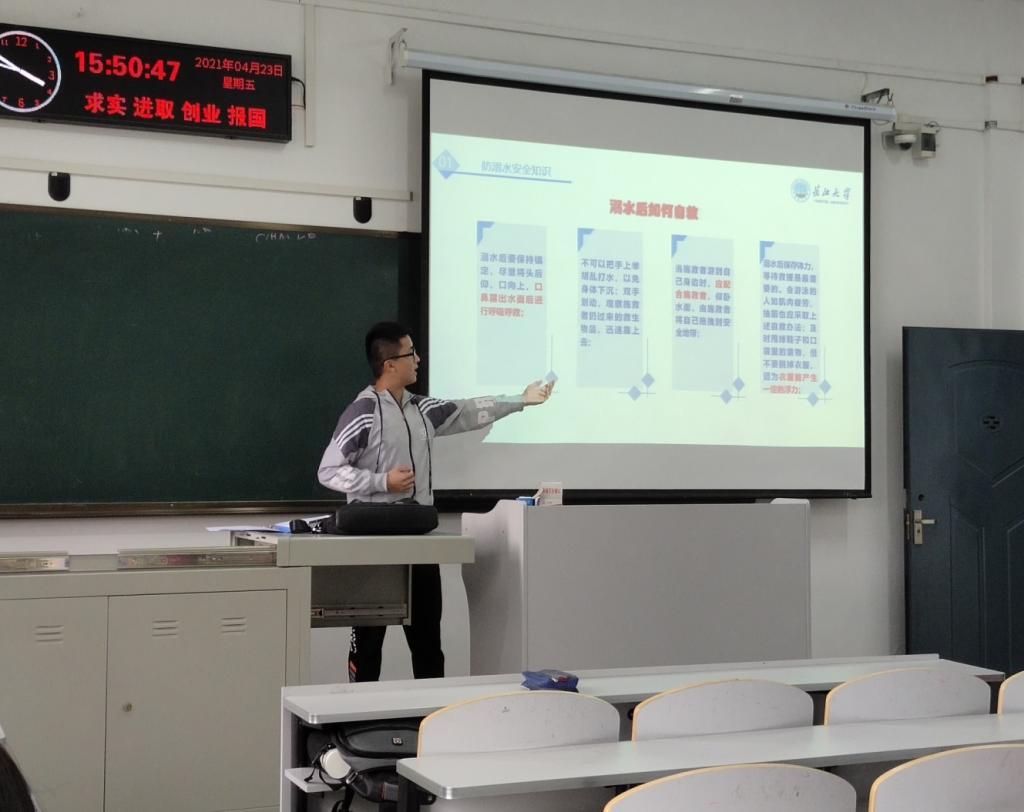 班会结束后,公司党委副书记谭亮魁联合分管辅导员,通过QQ群消息等方式深入、全面提醒同学们同学们“五一”期间要远离危险水域,远离不熟悉的水域,警惕溺水事件的发生。一定要牢记防溺水安全常识,做到“六不准”,即:不准私自下水游泳;不准擅自与他人结伴游泳;不准在无家长或老师带领的情况下游泳;不准到无安全设施、无救援人员的水域游泳;不准到不熟悉的水域游泳;不准不会水性的员工擅自下水施救。