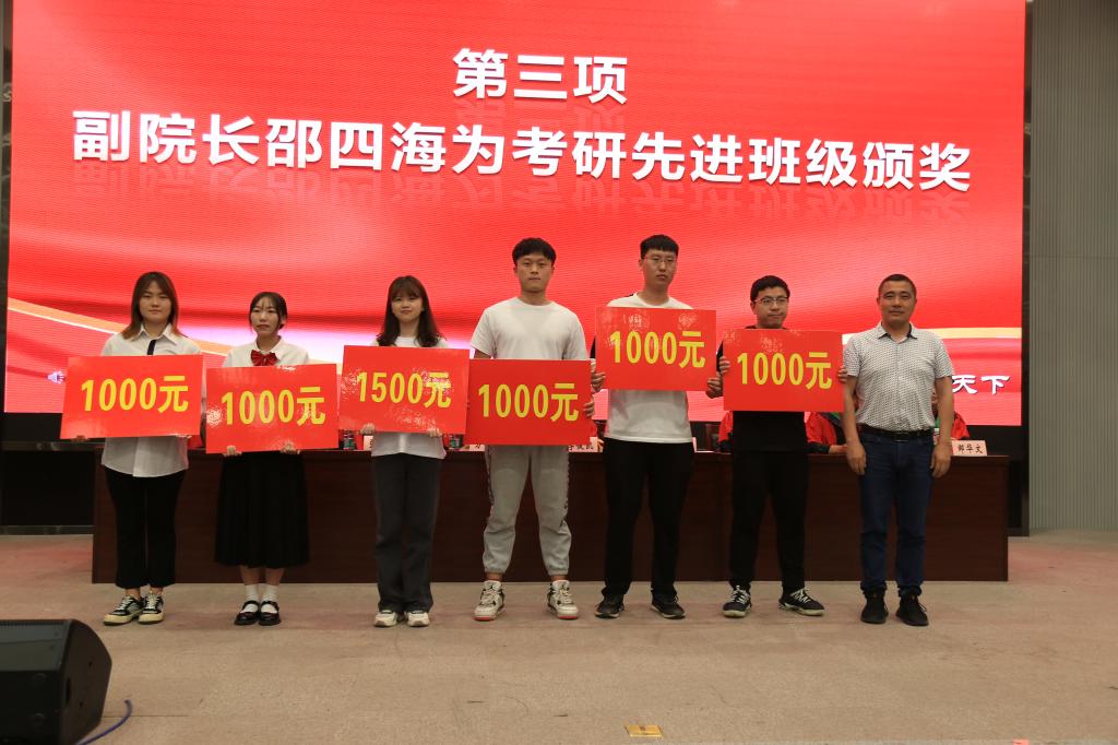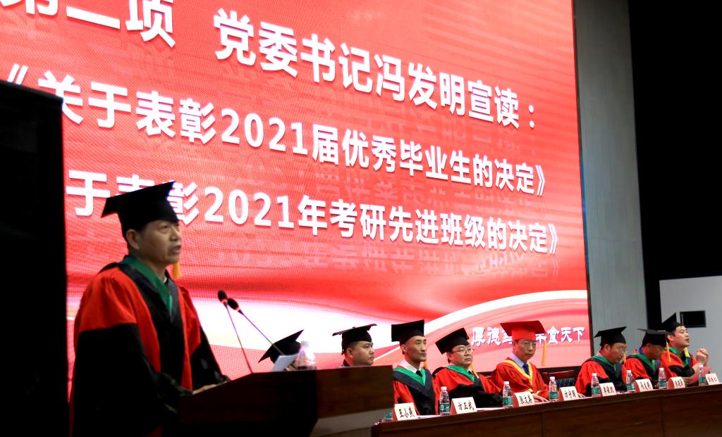仪式在庄严的国歌声中揭开了序幕。党委书记冯发明宣读了《关于表彰2021届优秀毕业生的决定》、《关于表彰2021年考研先进班级的决定》。华强化工集团党委副书记王建波为优秀毕业生颁奖,yl7703永利行政副经理邵四海为考研先进班级颁奖。