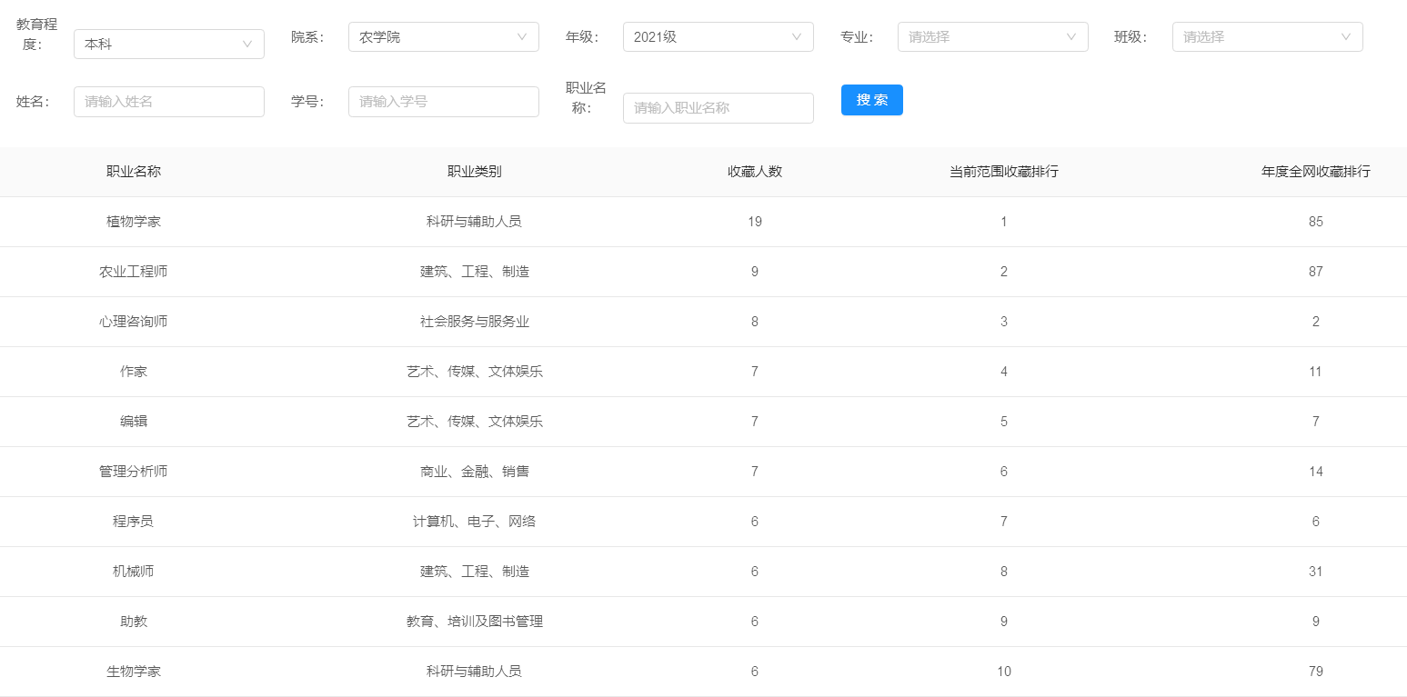 在职业收藏排行中,可以看到新生收藏的前五名依次是:第一名为“植物学家”,收藏人数19人;第二名为“农业工程师”,收藏人数9人;第三名为“心理咨询师”,收藏人数8人;第四名为“作家”、“编辑”和“管理分析师”,收藏人数均为7人;第五名为“程序员”、“机械师”、“助教”和“生物学家”。