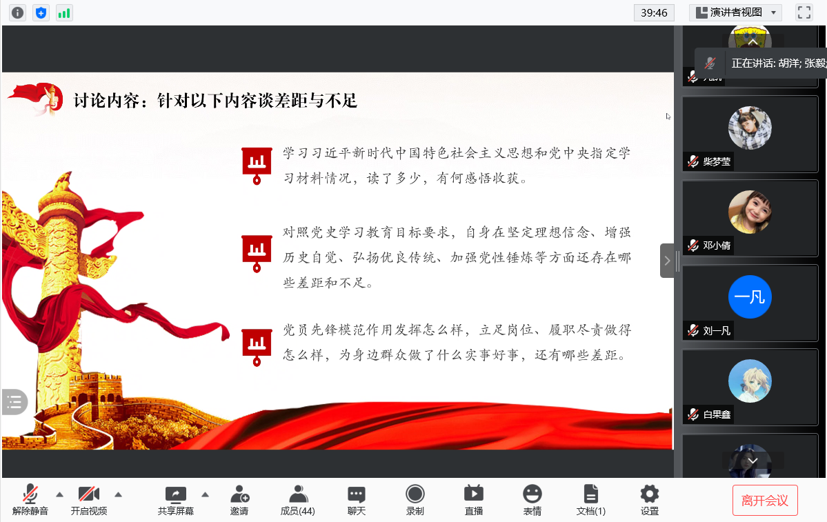 其中,张毅同志说到:“应该对于党员的身份意识、组织纪律性和组织观念性有更深刻的认识”,并提到学党史应该系统地、认真地、持之以恒地学习,且要树立大的历史观在历史的长河里探究历史演变规律。房康睿同志也积极发言说到:“作为一名党员应该重视学习,终结历史,明白要做什么、怎么做,且要多读书”。