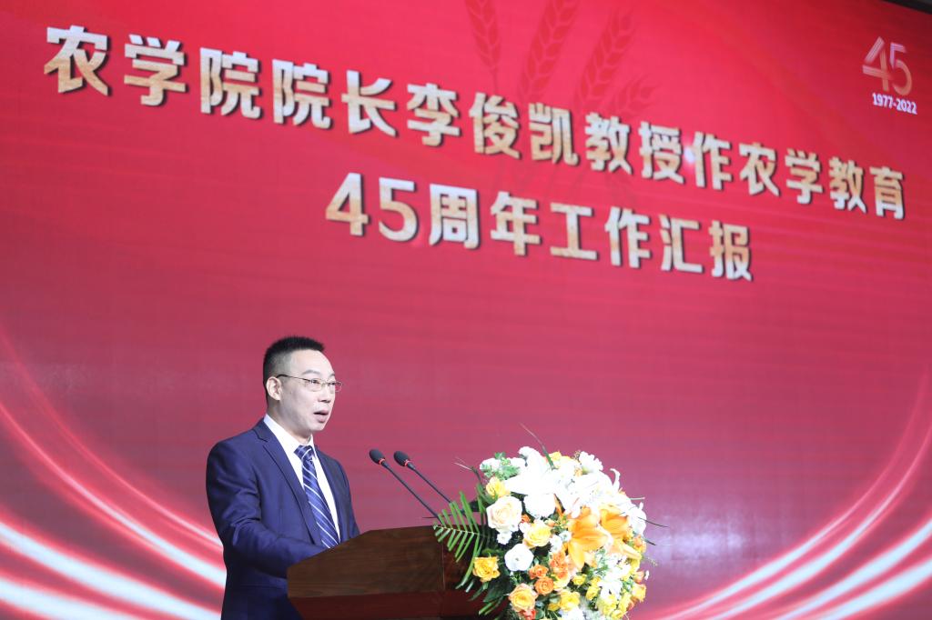 yl7703永利经理李俊凯作农学教育45周年工作汇报。他从“感恩心、冲天劲、尚农情”三个方面全面系统地总结了农学教育45年来在团队队伍建设、团队建设与研究生教育、专业建设与人才培养、科学研究与社会服务、公司治理与文化建设等方面取得的丰硕成果。