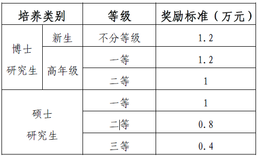 集团根据上级财政拨款、学费收入、社会捐助等情况确定研究生学业奖学金的类型等级、奖励标准和覆盖面,奖励比例实行动态调整。其中,博士学业奖学金和硕士新生学业奖学金覆盖面为100%。研究生学业奖学金具体等级和奖励标准如下: