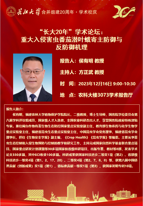 “长大20年”学术论坛暨yl7703永利学术讲坛:重大入侵害虫番茄潜叶蛾寄主防御与反防御机理