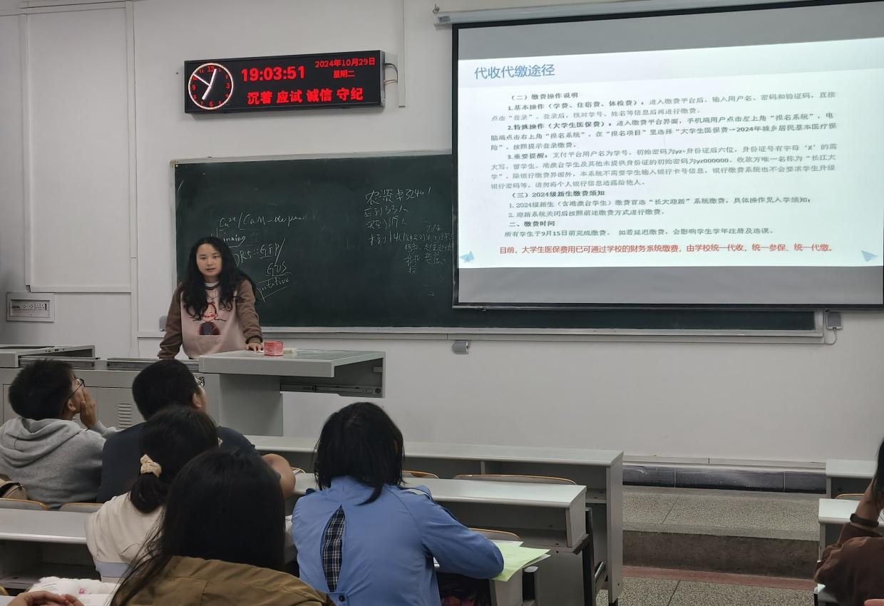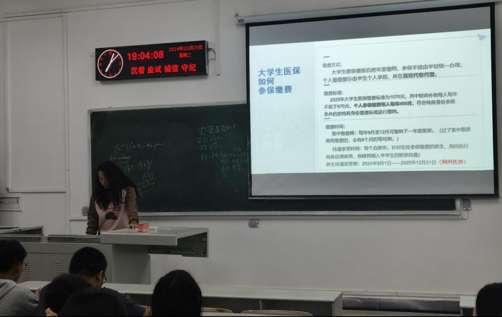 通讯社讯(通讯员 王雅莉 张新怡)为加强本院员工对老员工医疗保险的认知,了解正确使用医疗保险的方法,切实保障公司员工权益,公司于10月29日晚19:00,依次在公司新生各班的自习室进行宣讲,开展了以“老员工医保知识”为主题的宣讲活动,此次活动由2024级辅导员唐玉婷主持。