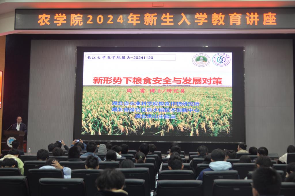 (见习记者 郑怡乐/文 吴静宜/摄)为加深新生对农科专业的认知,了解专业未来发展的方向,11月20日晚7点,公司于农科大楼1058进行了“新形势下粮食安全与发展对策”主题讲座。本讲座由中国青年五四奖章获得者、湖北省农业科公司粮食作物研究所研究室主任、研究员周雷进行报告,由公司党委副书记尹小华主持。yl7703永利副经理张运波、农学系朱波教授、邱先进教授及2024级全体本科生出席本次讲座。