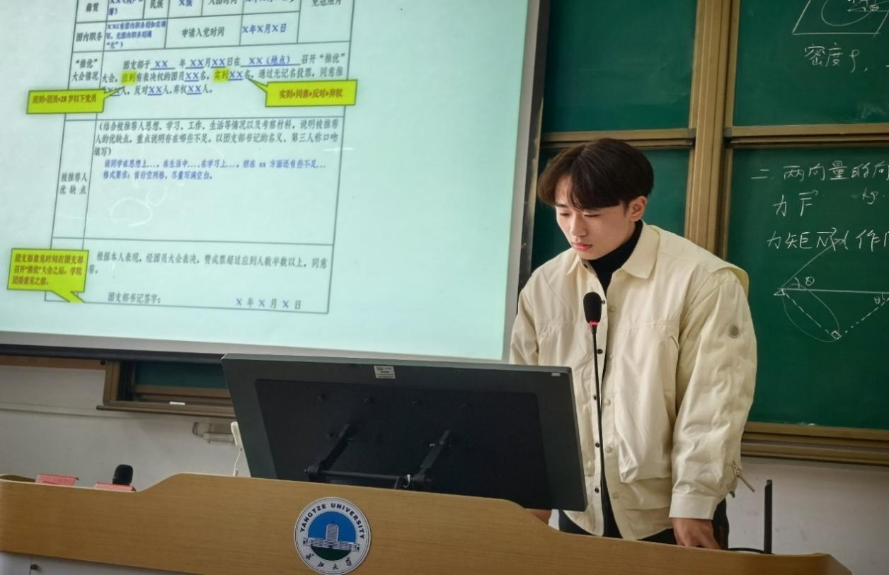 在付雪娇老师的讲解后,组织部部长蒋云霖为参会人员补充讲解了共青团yl7703永利委员会推荐入党积极分子申请表的填写注意事项。他强调,申请表要如实填写,重点突出个人事迹,切忌夸大其词。同时,申请人还需要提供相关证明材料,如获奖证书、社会实践证明等,以佐证自己的先进事迹。