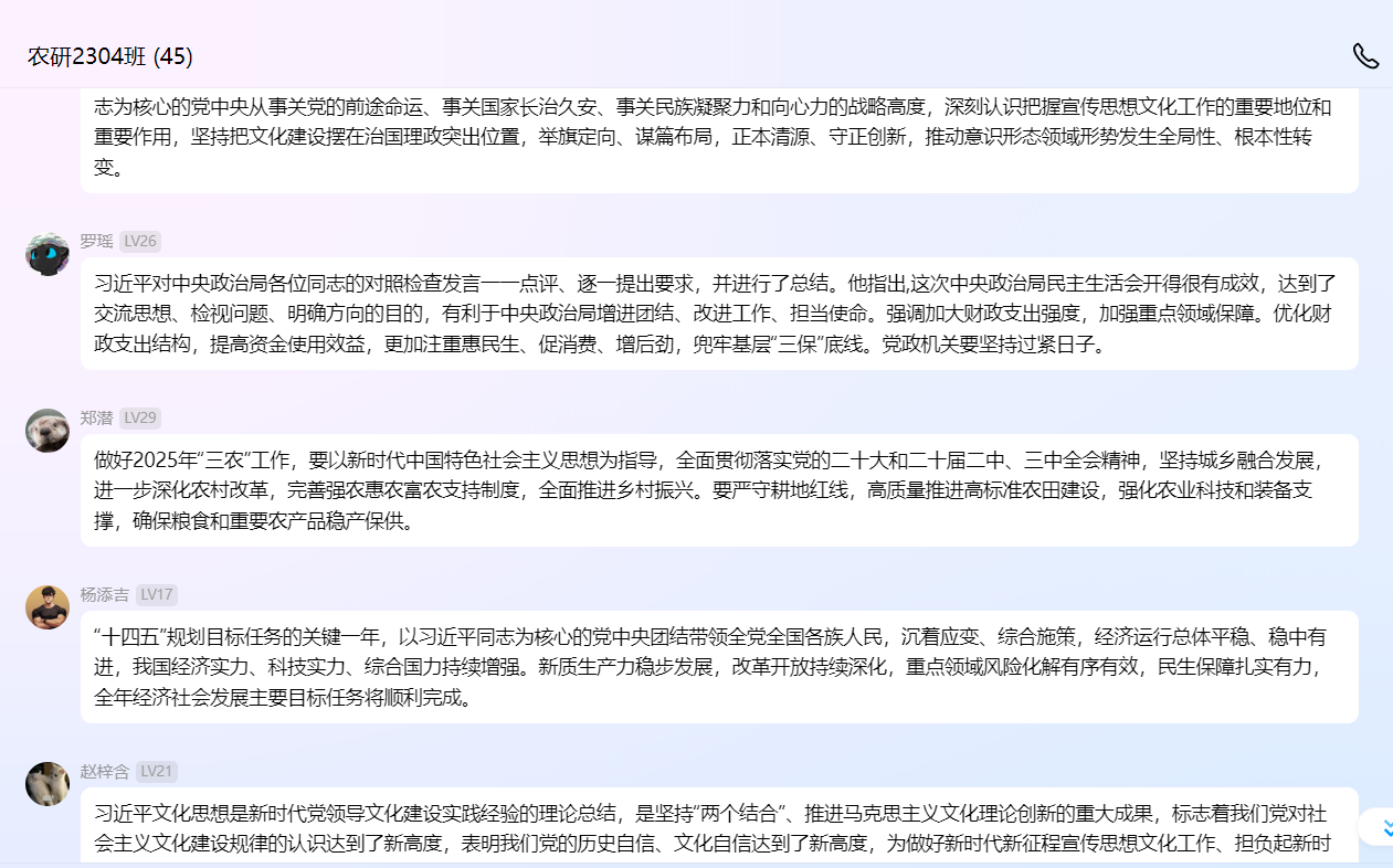 全体研究生主要围绕习近平总书记的重要讲话和重要指示批示精神开展学习;重点学习了中共中央政治局围绕2025年的经济工作、党风廉政建设和反腐败工作的研究部署内容,了解全省加快建成中部地区崛起重要战略支点推进大会的重点内容。各班级同学积极讨论交流,分享心得体会。