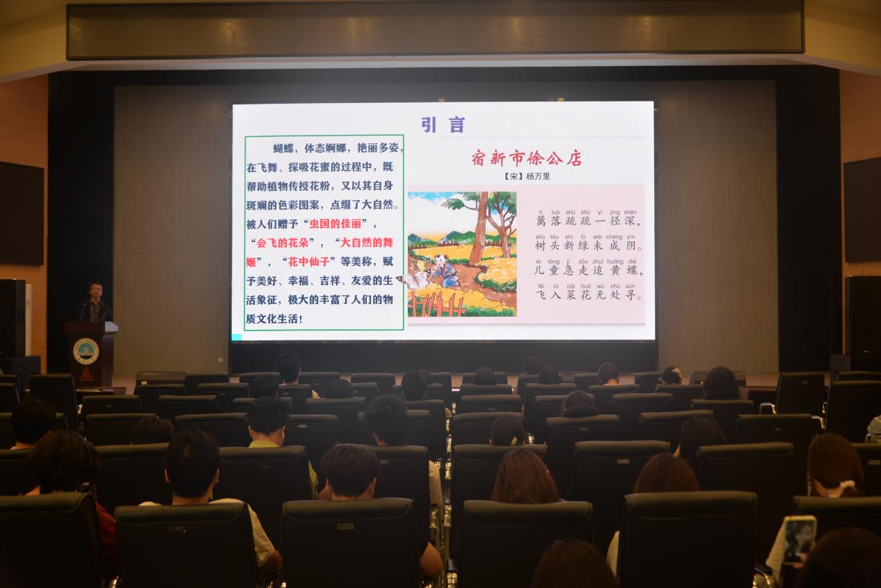 在文化层面,张教授带领大家穿梭时空,领略蝴蝶在人类文明中的多元象征。从中国《诗经》“庄生晓梦迷蝴蝶”的哲学隐喻,到梁祝化蝶承载的爱情理想;从美洲古文明视蝴蝶为灵魂使者,到现代时装、饰品中蝶翼纹样的创新应用,无一不展现蝴蝶与人类文化的深度交融。此外,张教授还分享了蝴蝶传说、诗词,以及被誉为“画中瑰宝”的蝶翅画,让同学们感受其独特魅力。