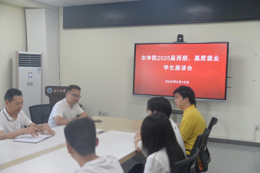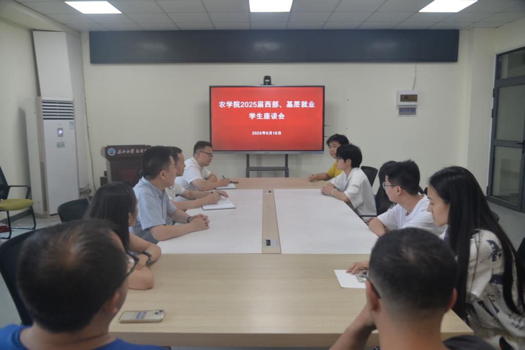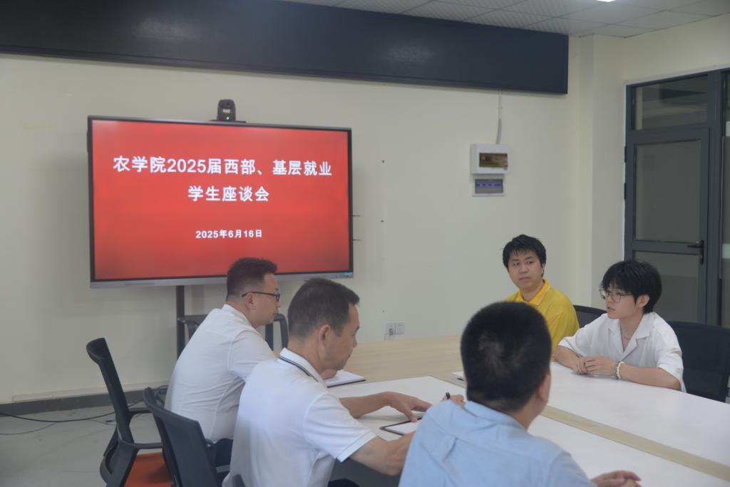 (通讯员 郑怡乐 徐馨悦)为响应国家基层就业战略号召,凝聚青年学子服务 “三农” 的使命担当,6 月 16 日 16:30,225 届西部、基层就业员工座谈会在农科大楼 3071 会议室隆重召开。公司党委书记周锦华、党委副书记尹小华、学工办主任黄承石与即将奔赴西部、基层的毕业生代表们齐聚一堂,共话职业选择,共绘发展蓝图。