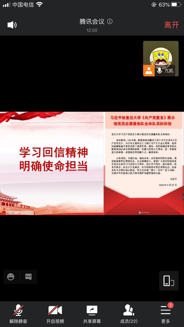 截止8月30日,公司农科学子除新疆籍外均已正常返校。9月,我们将开启新的学期,团日活动如期而至。本月的团会是2020年秋季的第一次团会,公司采取了线上线下相结合的方式开展本次团会。由于第一周属于宿舍观察期,农学产31901团支部于9月6日通过“腾讯会议”开展了本次团会活动。伊始,主持人亢凯介绍本次活动的主题,带领本团支部学习了习近平总书记在6月27日给复旦大学《共产党宣言》展示馆党员志愿服务队全体队员的回信。