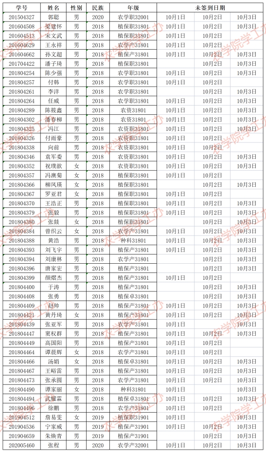 根据疫情防控形势以及集团要求,我院一直实行每日健康打卡制度,在国庆节期间(2021年10月1日-10月3日),经分管辅导员、学工助理、班干部多次提醒,仍有郭聪等47名同学未在规定时间内完成打卡,具体未打卡次数及日期如下: