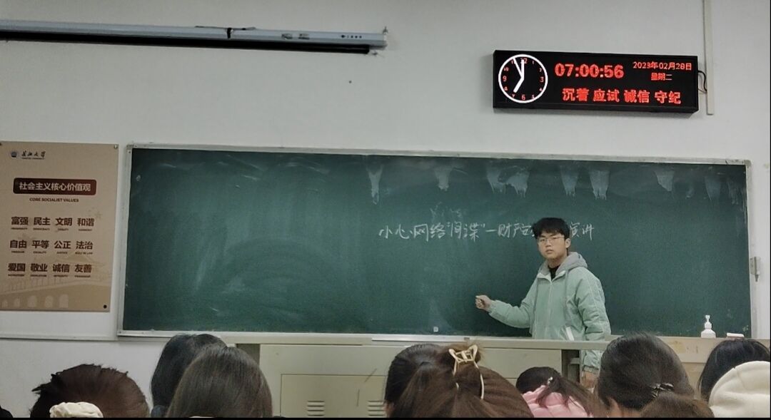 在互联网融入生活越来越深的今天,网络安全问题已然成为了高校安全法治教育的重头戏。农资32201班的陈文辉用一个个鲜活的真实事例,让我们看到了网络世界背后的灰暗——因轻信“网络刷单”、“网络兼职”等陷阱,被骗取个人财产,更有甚者用借贷来填“无底洞”,最终酿成了一桩桩令人惋惜的悲剧。他呼吁同学们利用好网络这把双刃剑,建立良好的防诈意识,提升鉴别网络陷阱的能力,构筑起公司网络安全的第一道防线。