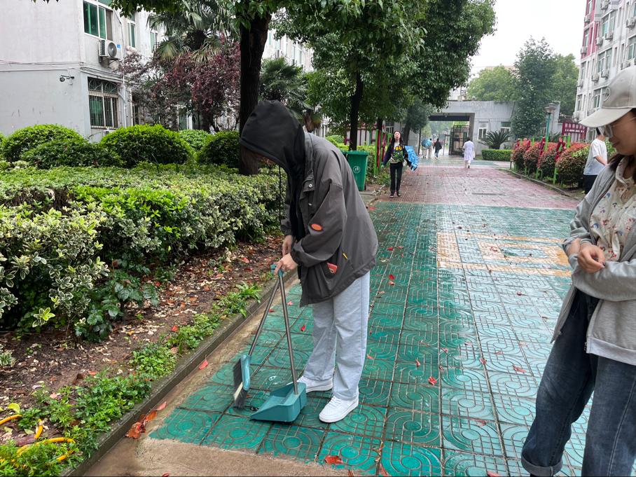 活动开始,同学们陆陆续续以寝室为单位走出寝室门,同学们手里拿着扫把、簸箕、垃圾袋等清扫工具,做好了十足的准备。紧接着同学们开始寻找各个打卡点的工作人员完成打卡签到,在签到地点进行着卫生清扫工作,下过雨的地面潮湿难清理,纸屑、塑料袋等垃圾粘黏在地板上对清扫来说又是一件困难的事情,但同学们依然充满斗志!