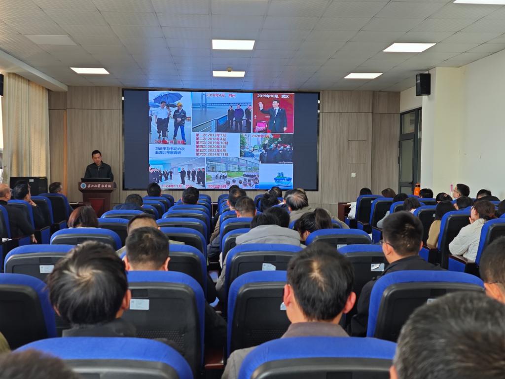 周锦华以“学习贯彻习近平总书记考察湖北重要讲话精神”为题,结合湖北省委、荆州市委、公司党委关于传达学习习近平总书记考察湖北重要讲话精神的有关要求,系统梳理了党的十八大以来,习近平总书记先后六次到湖北调研考察,对湖北工作作出的重要讲话和重要指示批示精神,特别是习近平总书记赋予湖北“建成支点、走在前列、谱写新篇”的目标定位,提出了“四个着力”( 2013年7月)、“四个切实”( 2018年4月)、“ 四点明确要求”(2024年11月)等重要要求,为湖北改革发展擘画蓝图、指路引航,有力推进了中国式现代化湖北实践。周锦华结合省委发出的“奋力推进中国式现代化湖北实践”动员令——“五个功能定位”、“五个以”实践体系、“五个一”推进机制、“五个关系”,要求广大党员、教师增强“四个意识”、坚定“四个自信”、做到“两个维护”,不断增强对推进中国式现代化湖北实践的政治认同、思想认同,落实立德树人根本任务,以强农兴农为己任,为奋力推进中国式现代化湖北实践提供智力支持和人才支撑。