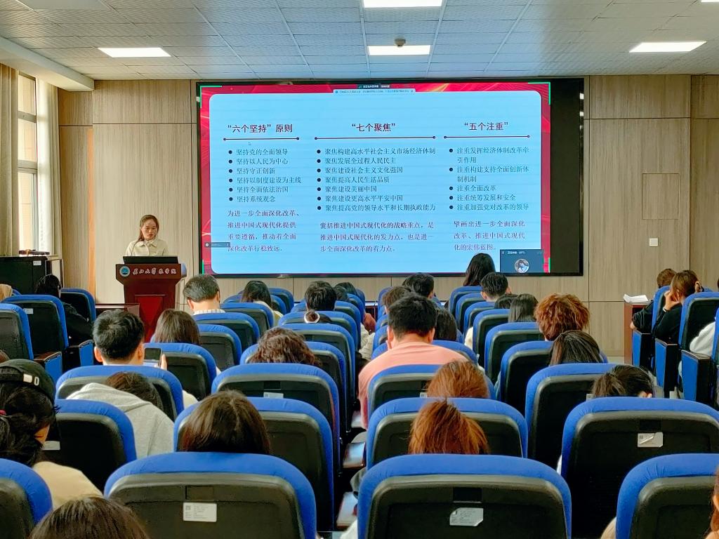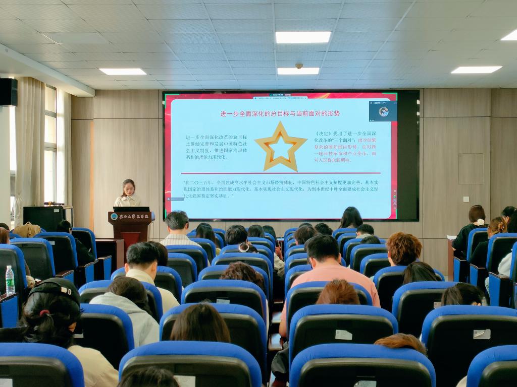 10月28日的培训由yl7703永利分团委书记付雪娇老师主讲。付雪娇老师以"蹄疾步稳谋改革,勇毅笃行谱新篇"为主题,全面、系统、深入地阐释和解读了党的二十届三中全会精神内涵。她从党的二十届三中全会的主题由来、召开意义、做出的部署与创新四个方面,为我们呈现了一幅生动的图景。