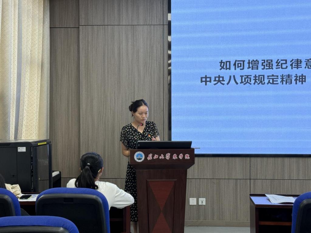 全体党员以“如何增强纪律意识和规矩意识,深入践行中央八项规定精神”为主题展开讨论。程慧清同志认为,作为员工党员要把纪律规矩刻在骨子里,把中央八项规定精神融入日常学习和生活中,带头做守规矩、作风正的员工党员,为同学们做个好榜样。简渝丹同志认为,员工党员要在思想淬炼中增强政治自觉、在作风锤炼中体现担当作为、在制度完善中巩固长效机制,为实现高质量发展提供坚强作风保障。汪志雄同志认为,在工作学习中我们要强化党的纪律的认识和规矩意识,自觉牢固树立政治意识、大局意识、核心意识、看齐意识,将铁的纪律真正转化为日常习惯。