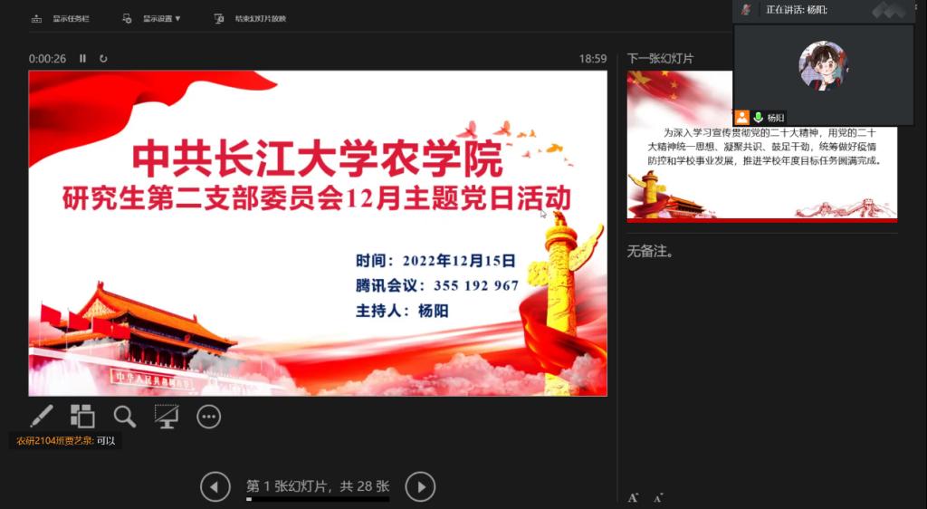 会议伊始,组织委员吴怡燃同志带领全体党员重温入党誓词。紧接着,杨阳同志对本月党费交纳情况进行说明。随后,由杨阳、刘曼莹、张浩然、贾艺泉和雷尧同志轮流诵读《中国共产党章程(修正案)》总纲相关内容,集体观看《二十大报告解读:科教兴国人才强国》和《二十大代表风采录——路丙辉:一路烛光》两个学习视频。接着,进入党课与集体学习党的创新理论环节,由曹佩娜、周璇同志分别讲授党课——《解读党的二十大报告主要精神》和微党课——《缅怀伟大的江泽民同志》;邓小倩同志带领学习《习近平谈治国理政》第四卷第六至第十部分;魏展鹏同志带领学习《习近平总书记主持召开中共中央政治局常务委员会 会议听取新冠肺炎疫情防控工作汇报 研究部署进一步优化防控工作》;刘至幸同志带领学习《中共yl7703永利委员会关于深入学习宣传贯彻党的二十大精神的通知》。通过此次理论学习,我们深刻认识到面对严峻的疫情形势,我们要当好自己健康的第一责任人,不恐慌不焦虑,以积极的心态配合疫情防控工作,坚决打赢疫情防控阻击战;同时认真研读政策,紧跟时代步伐,全国上下勠力同心,挺过艰难时刻,以实际行动贯彻落实党的二十大精神。