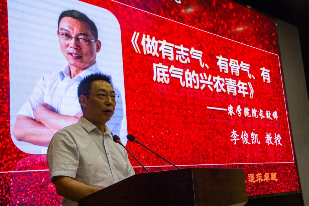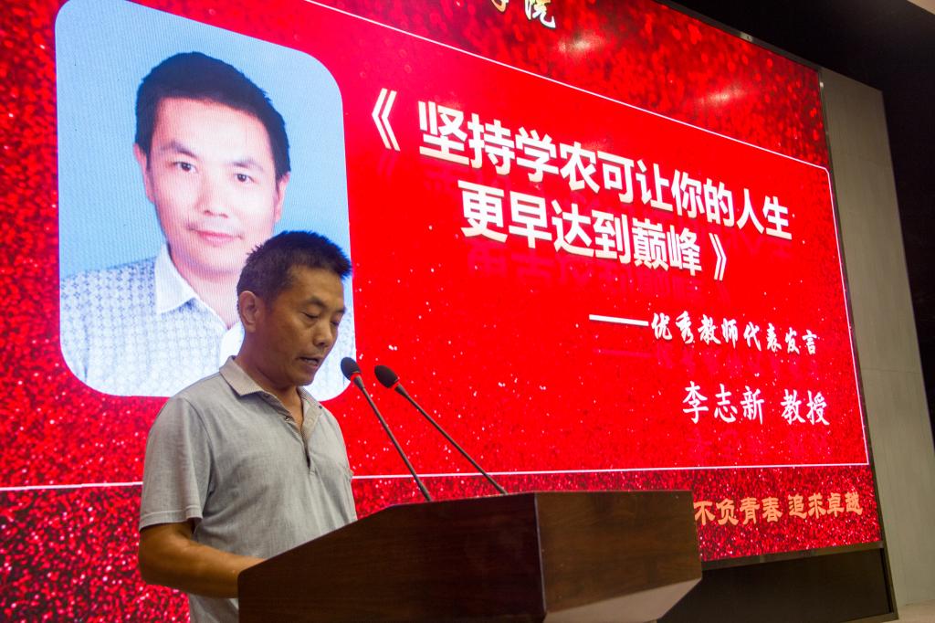 优秀教师代表、两系杂交稻新品种“春两优长 70” 的主持选育人李志新教授结合自己的亲身经历介绍了学农的前景以及yl7703永利的团队力量、团队建设、科研成果等内容,鼓励同学们要坚定理想,专心学业。“只有比别人更付出、更勤奋,通过自身勤奋刻苦才能成为优秀的科学家”,李教授郑重地说道。