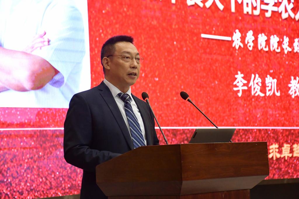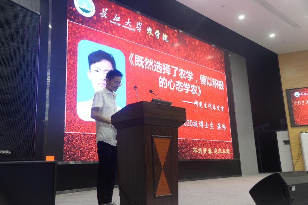 研究生代表蒋伟以“既然选择了农学,便以积极的心态学农”为题发言。蒋伟向同学们讲述了自己的求学经历,鼓励同学们坚定自己的目标,厚积薄发,戒骄戒躁。将“要我学”变成“我要学”、“我想学”,蒋伟表示,如果知道自己想要的是什么,那么再枯燥的实验都会变得精彩有趣。他也向同学们分享了自己的经验,并表示“不是看到希望才坚持,而是只有坚持才会看到希望。”