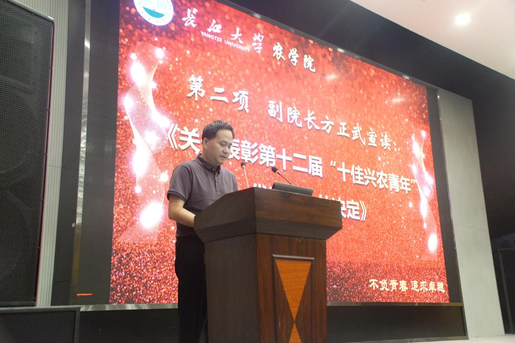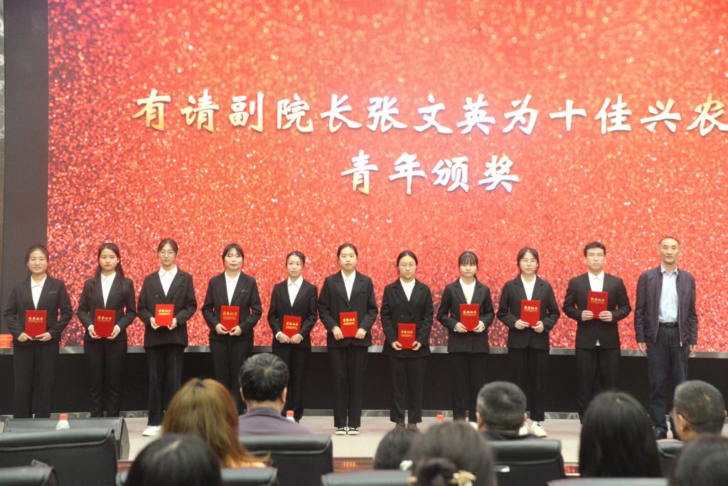 yl7703永利副经理方正武宣读第十二届“十佳兴农青年”表彰文件,并向获奖同学表示祝贺,鼓励他们再接再厉,也鼓励广大同学全面发展,努力成为创新型农业高质量人才。副经理张文英为这十佳兴农青年颁奖并合影留念。