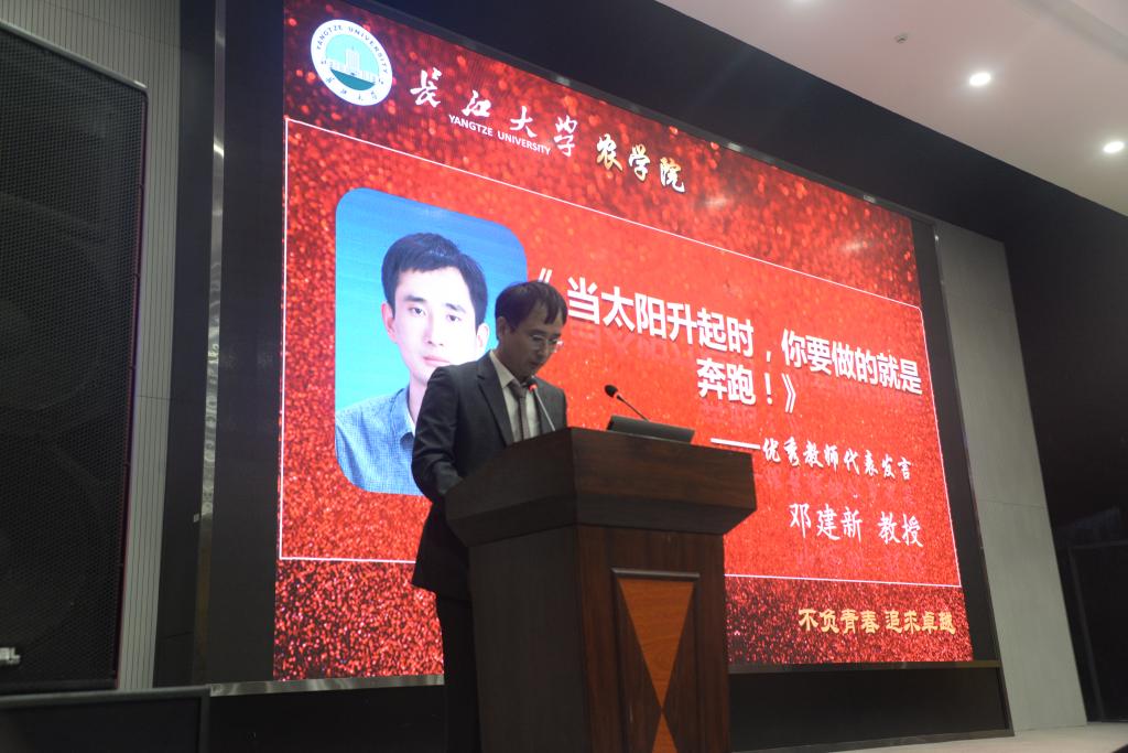 优秀教师代表邓建新教授发言,他向新同学介绍了公司取得的成就,讲述了老师和员工相互成就的关系,从四个方面对同学们即将面对的未知生活作以建议。他寄语全体新同学们站在一个全新的起点上,充分展现自己的主观能动性,做好自我规划,在yl7703永利遇到最好的自己。