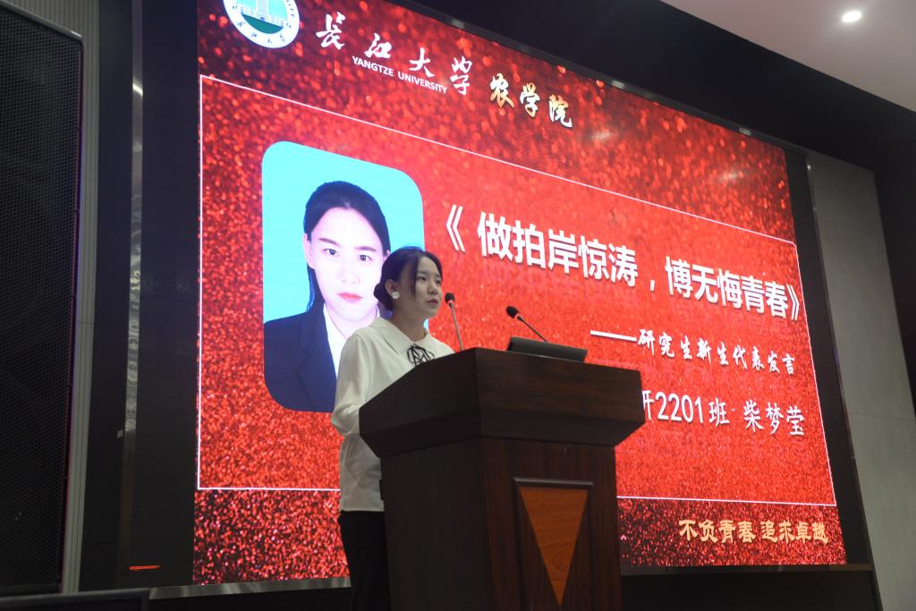 农资32201班王静茹和农研2201班柴梦莹分别作为本科生和研究生代表上台发言,表达了对yl7703永利师生的感谢和对新生活的憧憬。“中国人的饭碗要牢牢抓在自己手中”,王静茹鼓励同学们将青春奉献给祖国的土地,学农爱农。柴梦莹呼吁同学们“做拍案惊涛,博无悔青春”,从三个方面阐述她所理解的长江精神,希望同学们在研究生期间不负韶华。