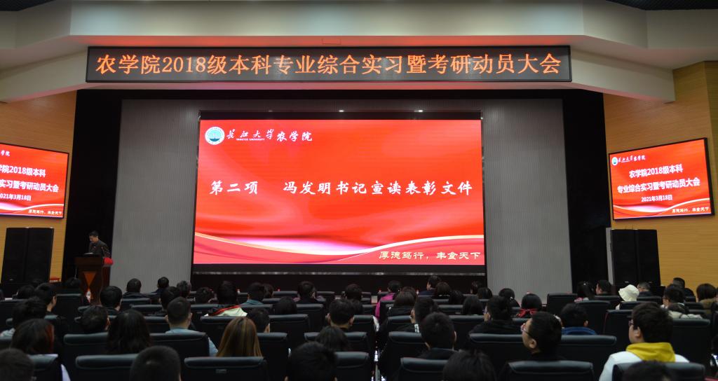 通讯社讯(员工记者 黄俊杰/文 刘思慧/摄)为增进员工对专业综合实习的认识,提高员工考研积极性,树立考研深造的信心。3月18日晚7时,公司于农科大楼1058报告厅举行2018级本科专业综合实习暨考研动员大会。公司党委书记冯发明副教授、副经理张文英教授、副经理方正武教授,两名专职辅导员代表、2018级和2019级全体班主任老师与本科生,团委员工会2020级全体干事参与了此次大会,会议由公司党委副书记谭亮魁主持。