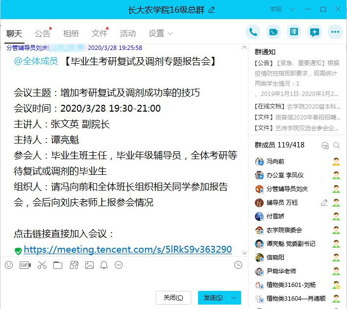 通讯社讯(通讯员 刘庆)为了提升毕业生考研复试与调剂成功率,3月28日19:30,yl7703永利利用“腾讯会议”平台,特邀分管教学副经理张文英与110名考研毕业生进行线上交流,为毕业生的考研复试与调剂指点迷津,毕业生班主任、年级辅导员参加报告会。报告会由党委副书记谭亮魁主持。